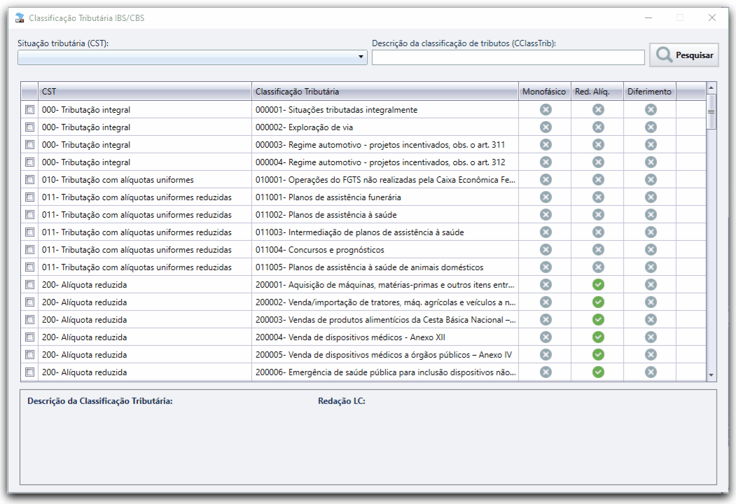 Caso prefira, informe a Descrição da classificação de tributos (CClassTrib) e clique em Pesquisar.