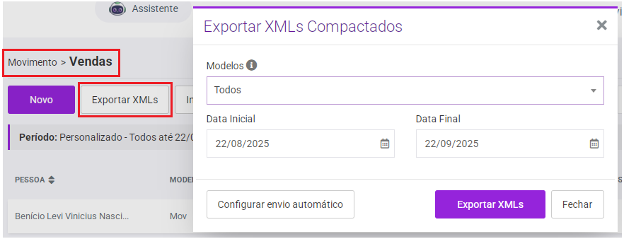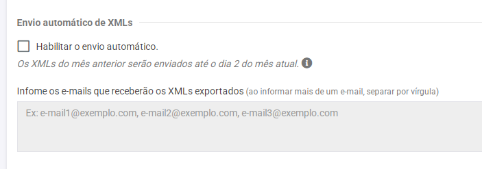 Na tela de de exportação existe a opção "Configurar envio automático". Ao clicar nela o site te redicionará para habilitar essa opção nas configurações do ERP4ME e preencher os e-mails que irão receber os arquivos xmls.