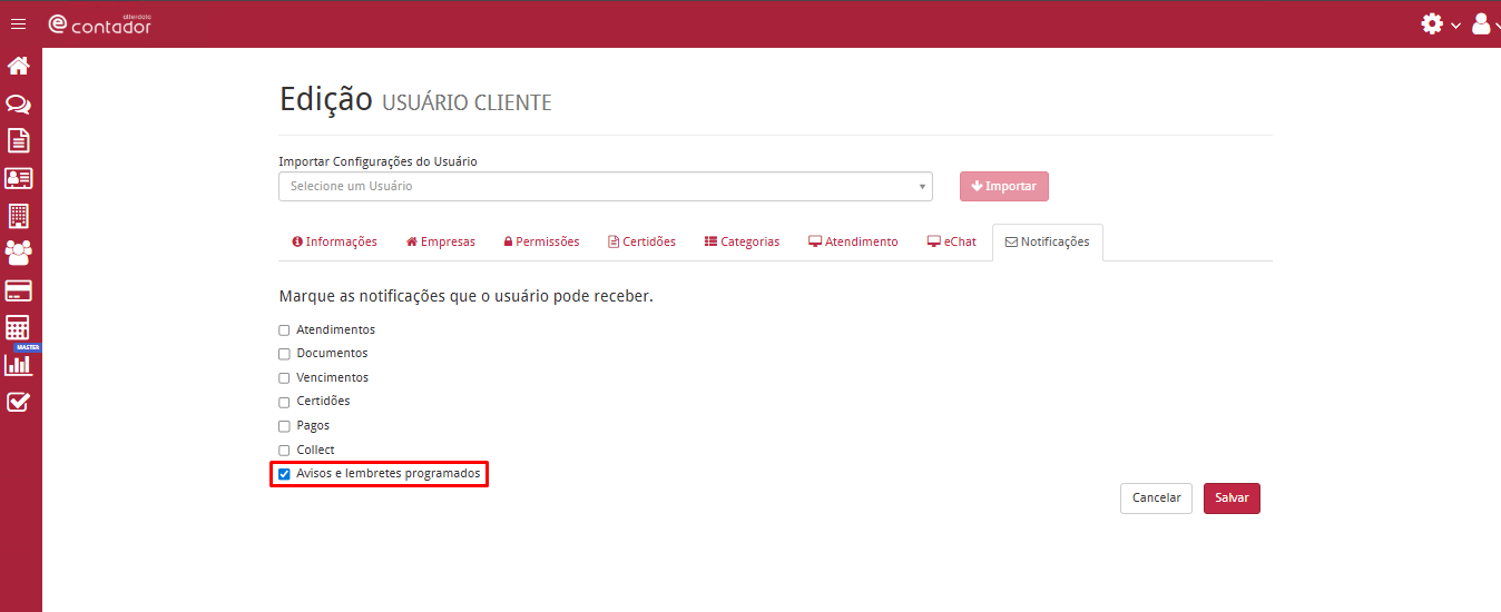 - Acessar a aba usuários > editar > notificações e marcar a opção "Avisos e lembretes programados"