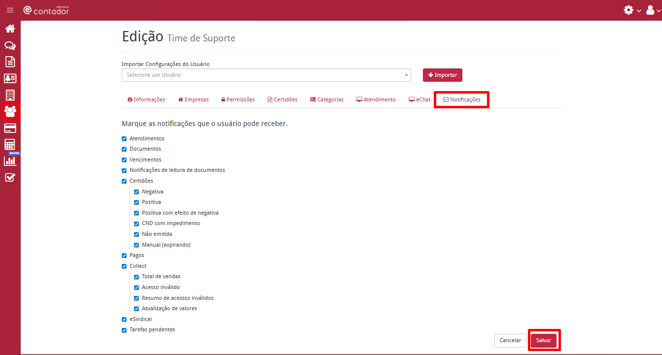 Depois, na aba Notificações,marque as notificações que o usuário deve receber;