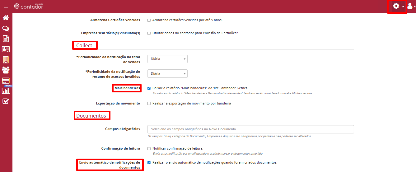 Em Documentos e Collect, marque as opções de Notificações desejadas;