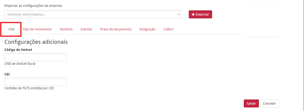 Na aba CND, informe os campos equivalentes as CNDs que a empresa irá controlar. Por exemplo, se for controlar a CND de imóvel Rural, informar no campo equivalente o código do imóvel.
