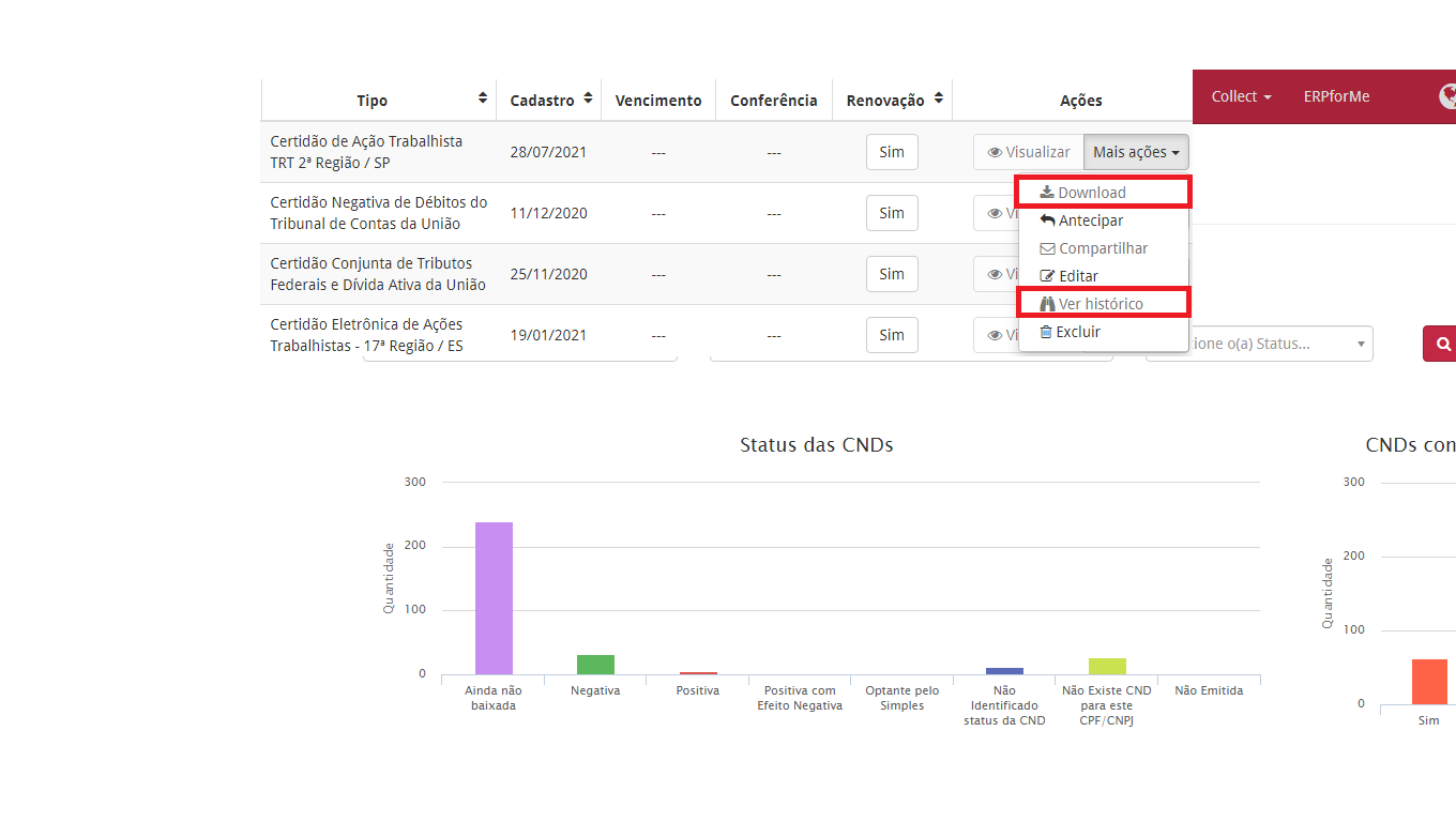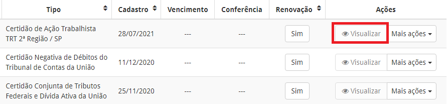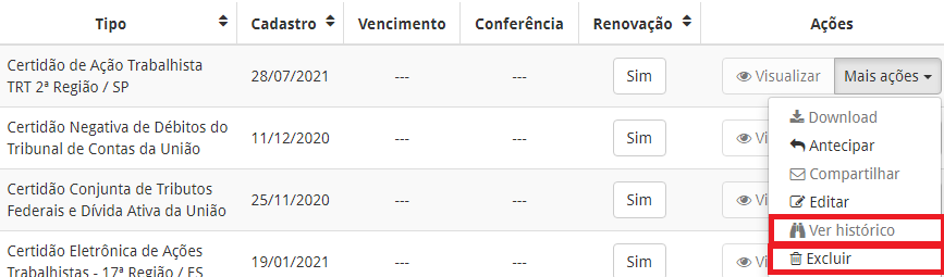 - Clique em Mais Ações / Ver histórico, ao lado da certidão.