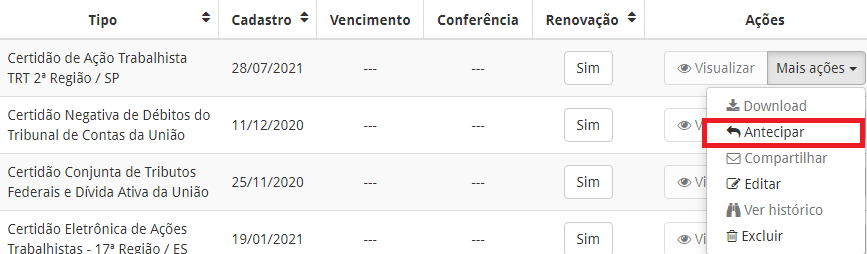 Clique em Mais Ações / Antecipar, ao lado da certidão.
