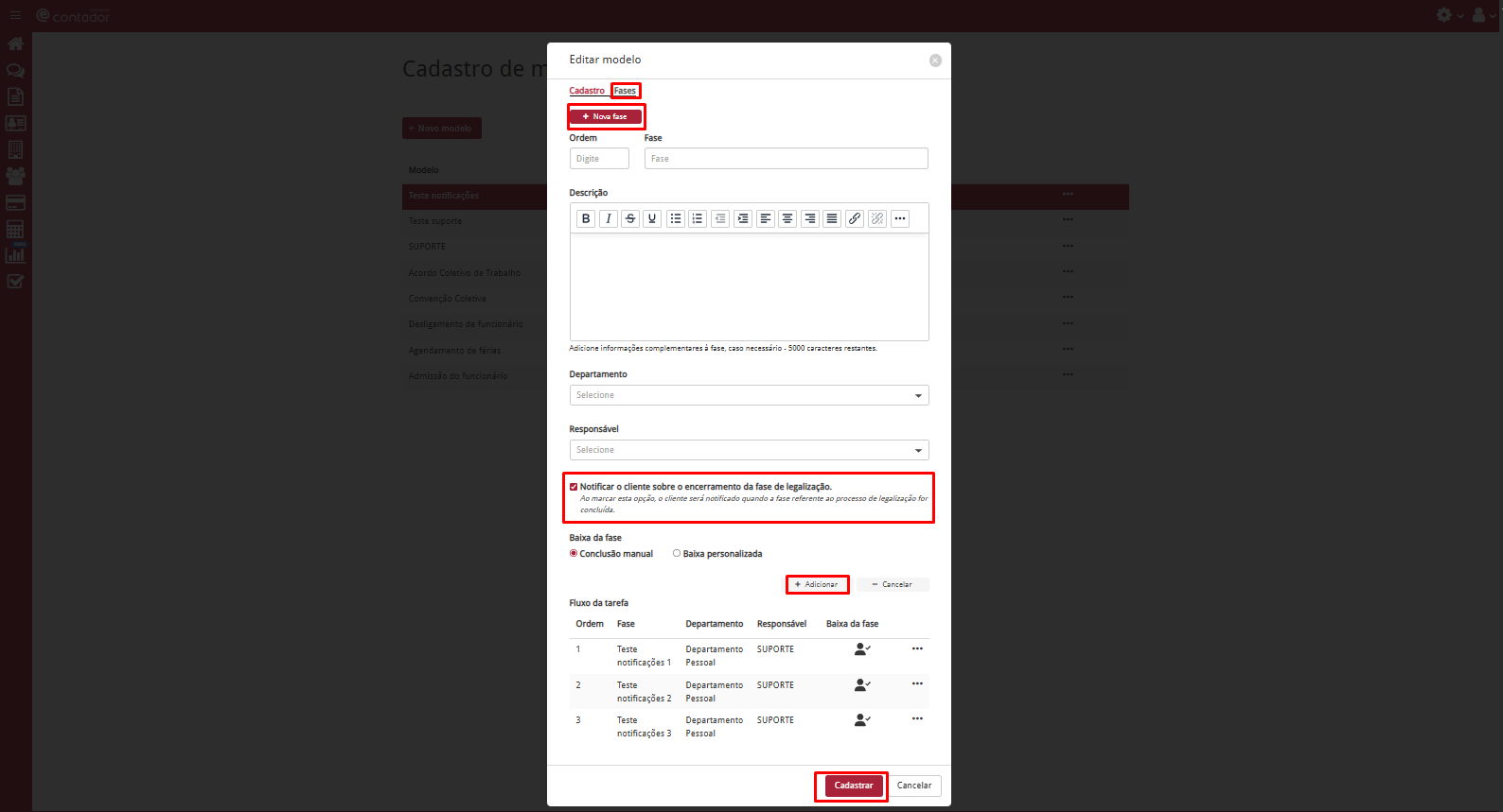 - Adicione a fase em Fluxo da Tarefa e clique em Cadastrar.