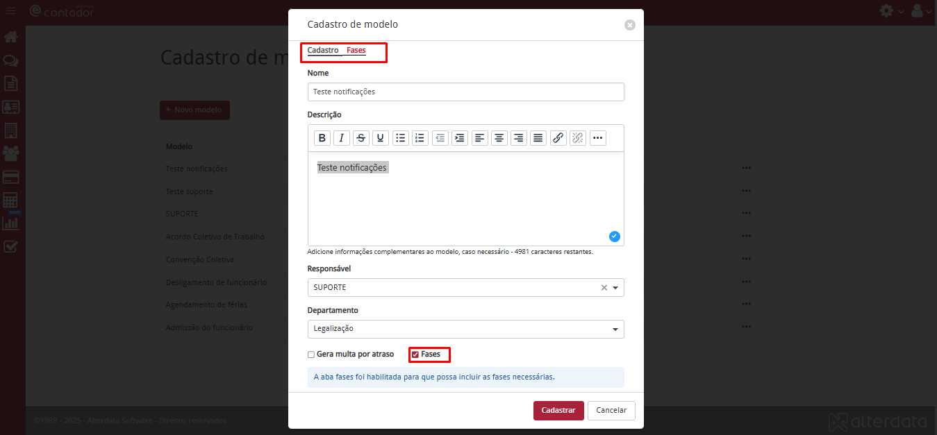 - Preencha o cadastro com os dados e as fases e em Departamento escolha a opção Legalização cadastrada anteriormente;