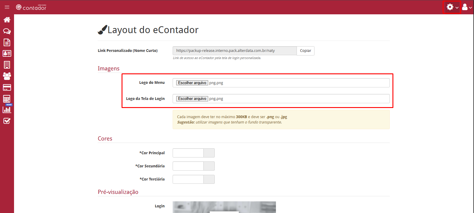 - No campo Imagens, selecione o arquivo no campo Logo do Menu e/ou Logo na Tela de Login;