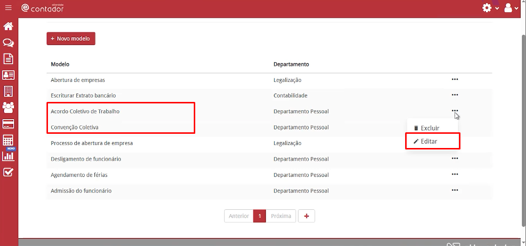 - Localize os modelos Acordo Coletivo de Trabalho e/ou Convenção Coletiva e clique nos três pontinhos e depois em Editar;