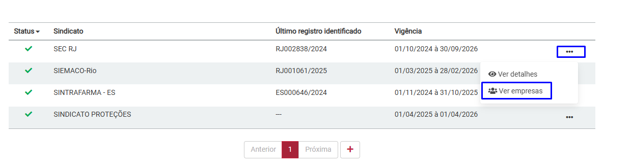 - Clique nos três pontinhos do sindicato e depois em Ver detalhes e Ver empresas.