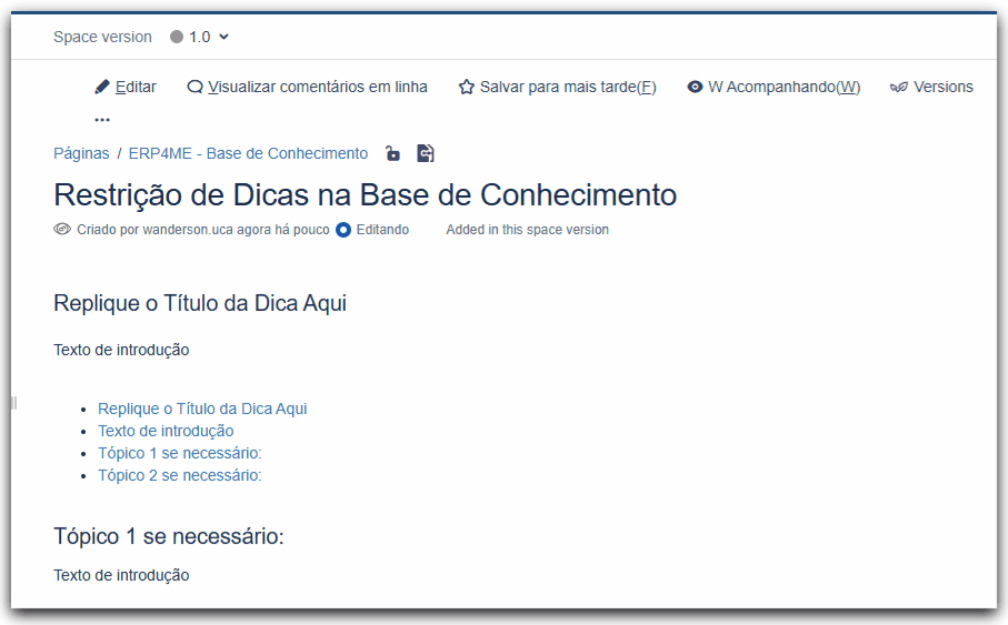 Assim, ao realizar a publicação de dicas, independente de marcar ou não a opção Publish only complete pages suas dicas restritas não estarão visíveis na área anônima do Centro de Aprendizagem. Para remover essa restrição, basta clicar o ícone e remover o grupo de usuários confluence-users e salvar.