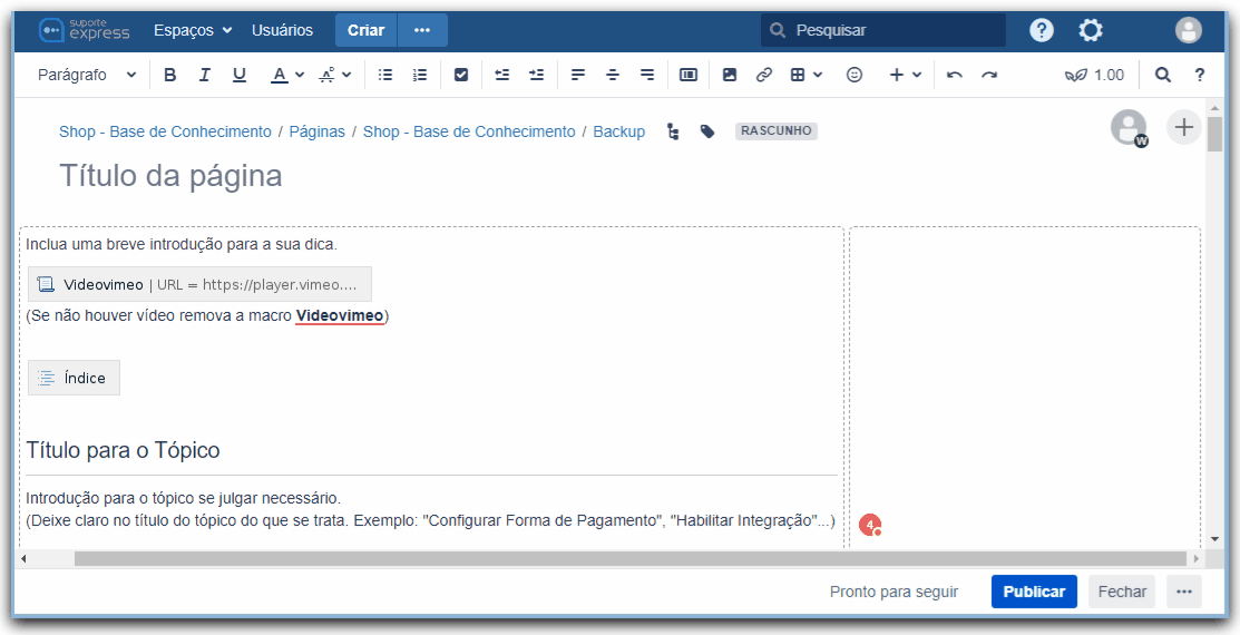Neste "Template" já haverá as "macros" previamente configuradas (Videovimeo, Coluna, Painel...) para agilizar a construção da sua dica.