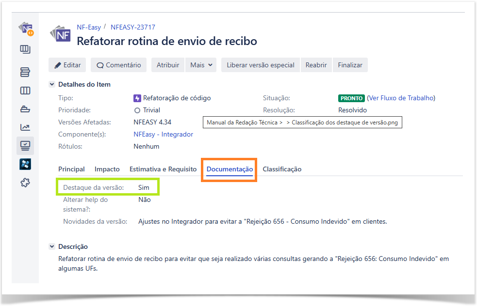 Observação! O problema de classificações incorretas no Jira gera retrabalho para a equipe de Redação, que precisa criar documentações de versão de forma retroativa. Isso atrasa a comunicação de novas funcionalidades, compromete a qualidade da documentação e dificulta o acompanhamento das tarefas, além de prolongar a curva de aprendizado de novos membros.