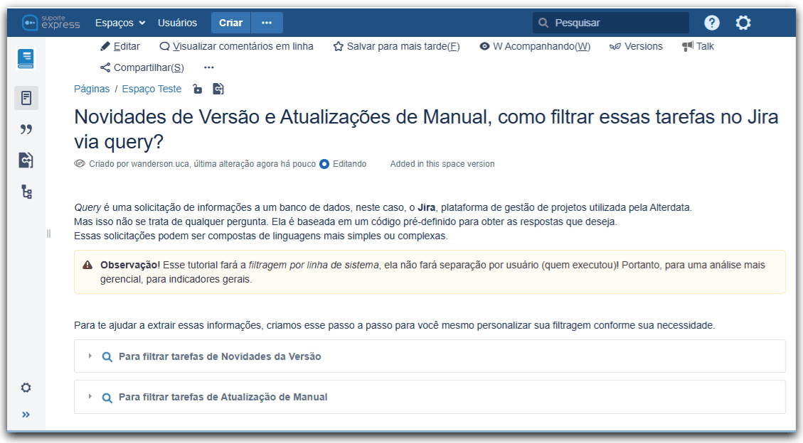 Para extrair análises das tarefas de Atualização de Manual realizadas pelo time da redação, personalize "querys" do Jira conforme a linha de sistema.