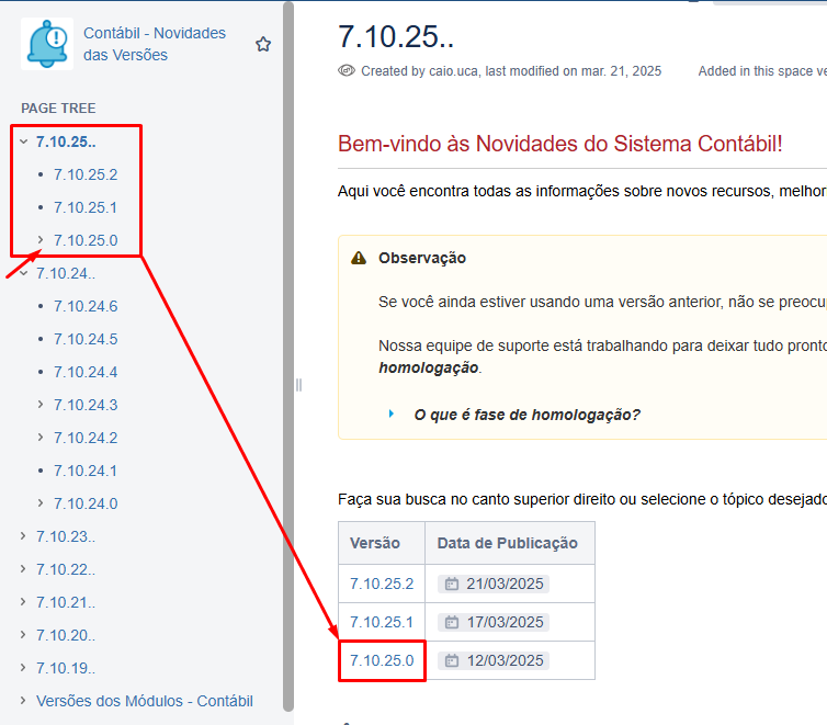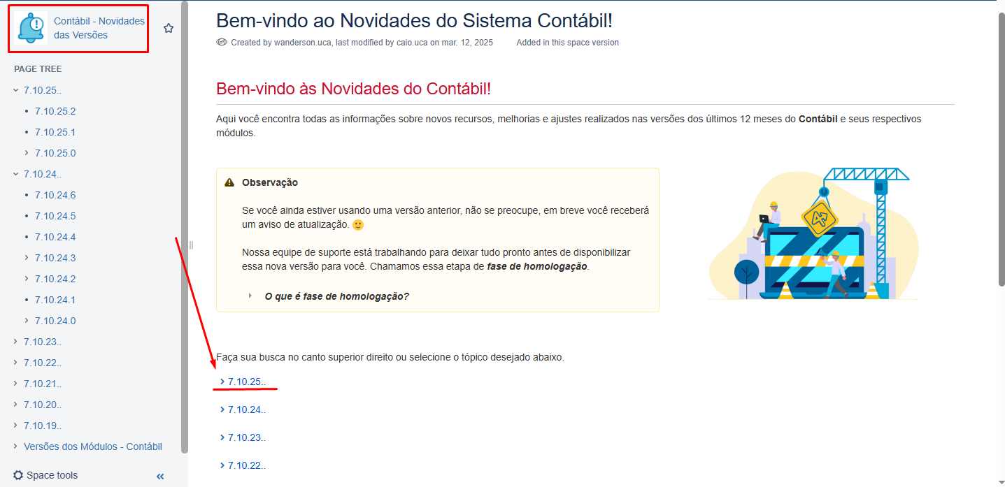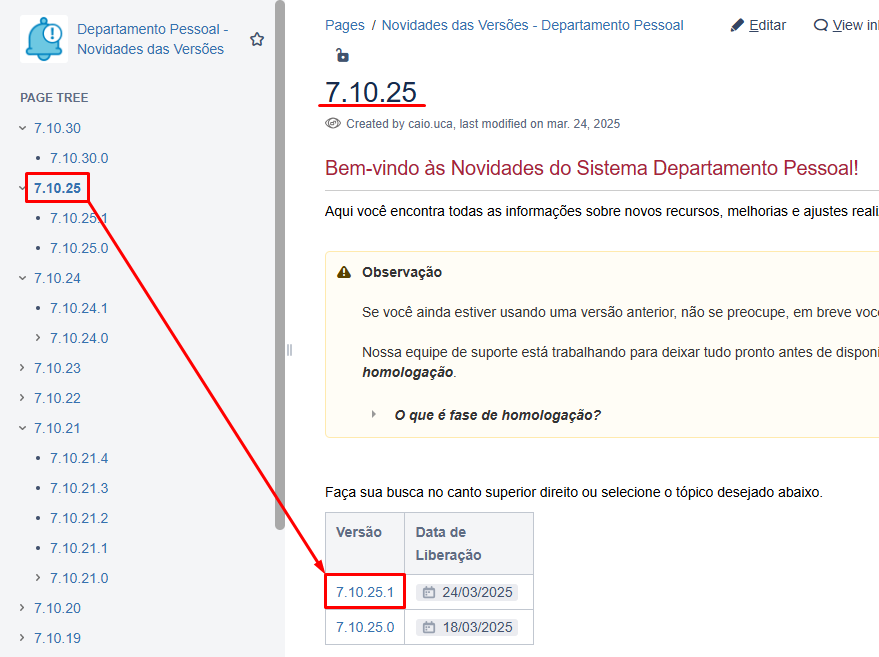 , como 7.10.25.. - Coloque a tabela de novidades das versões da página inicial criada em uma multiexcerpt.