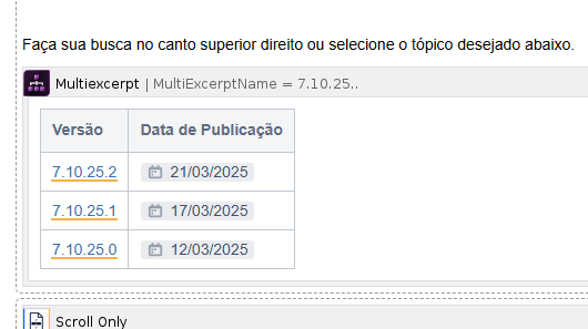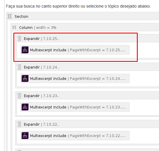 - Na página principal do espaço de novidades de versão, como Contábil - Novidades das Versões, inclua a macro "Multiexcerpt include" dentro de um "Expandir" na seção presente, referenciando ao multiexcerpt da tabela da página principal que acabou de criar.