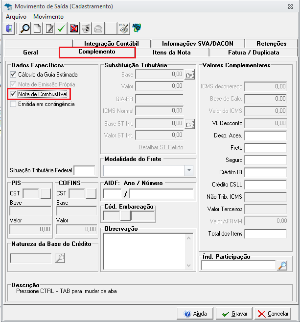 - Informe a empresa e o período, selecione onde deseja lançar a nota se é uma nota de entrada ou uma nota de saída, preencha as informações da nota e vá na aba Complemento, marque a opção Nota de Combustível;
