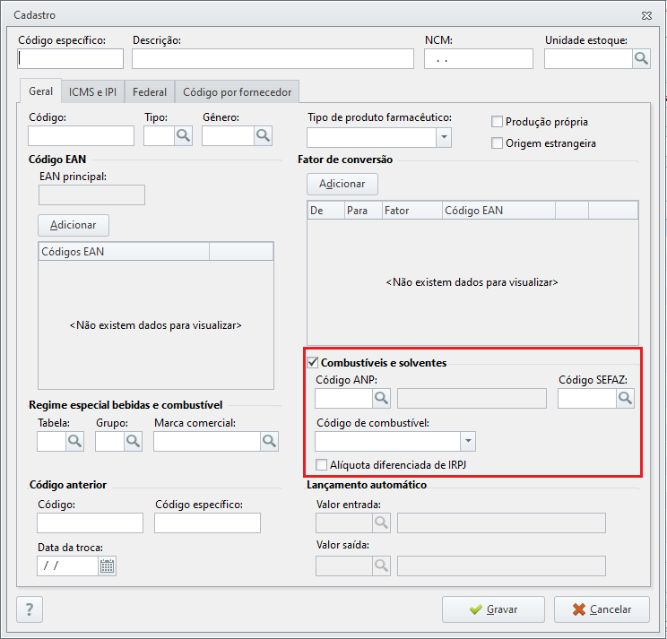 - Marque opção Combustível e solventes, depois preencha os campos Código ANP, Código SEFAZ e Código de combustível.;