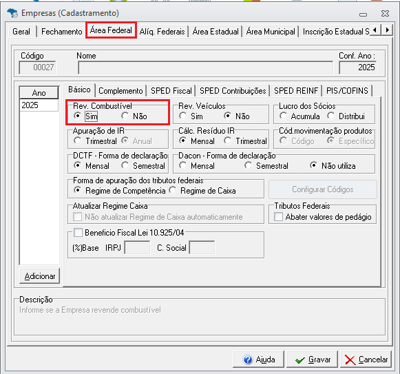 - Na aba Área Federal → sub aba Básico, no campo Rev. Combustível, marque a opção "Sim";