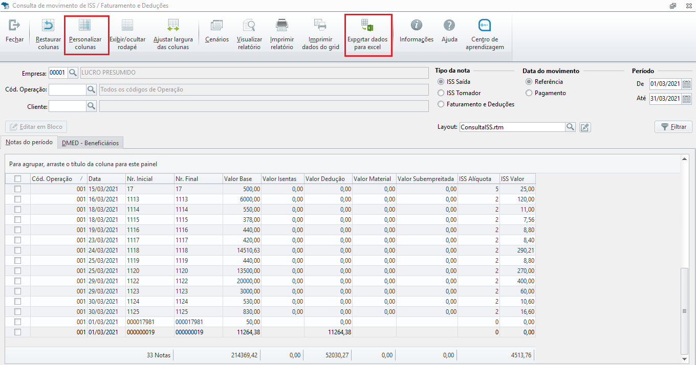 Como exportar notas de serviço em excel por ISS, Receitas e Deduções?