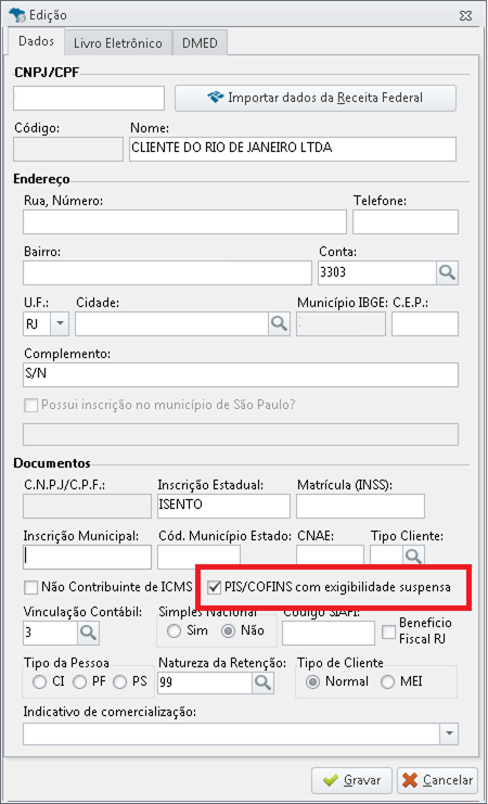 No cadastro de clientes, será necessário configurar marcando a opção PIS/COFINS com exigibilidade suspensa, para acessar vá em Cadastros > Clientes > aba Dados do cliente.