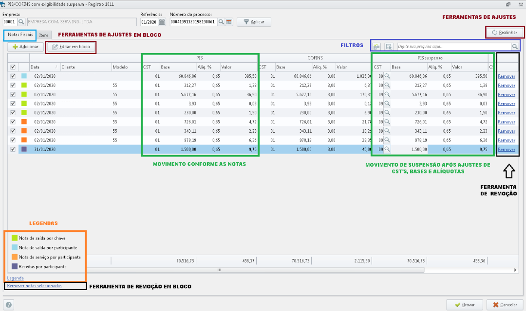 - No grid será demonstrado todo o movimento normal inclusive a informação tributada, mas será possível informar os CST's, bases e alíquotas de PIS e COFINS suspensos para que o sistema possa gerar o valor suspenso respectivo às contribuições.