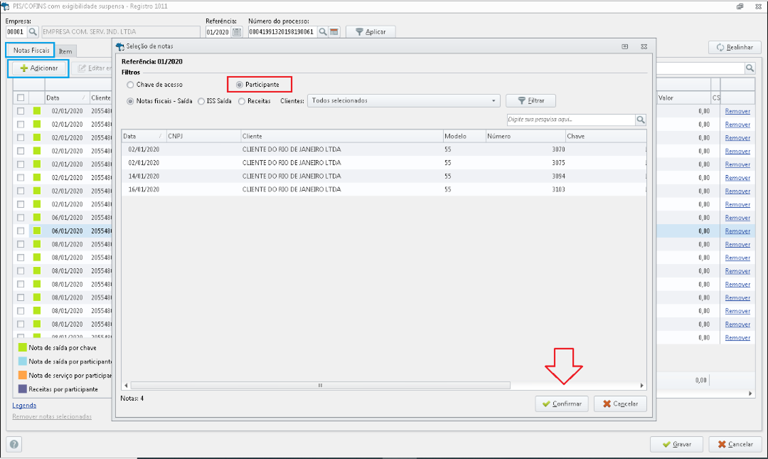 Participante: Nesta opção, será possível selecionar todo o movimento de documentos com determinado participante, para isto, é imprescindível que o cadastro do mesmo seja configurado. No módulo clique na guia Notas Fiscais > Adicionar > opção Participante selecione o tipo de movimento se Notas fiscais - Saída, ISS saída ou Receitas em Clientes selecione o/os clientes a serem filtrados, logo após clique em Confirmar.
