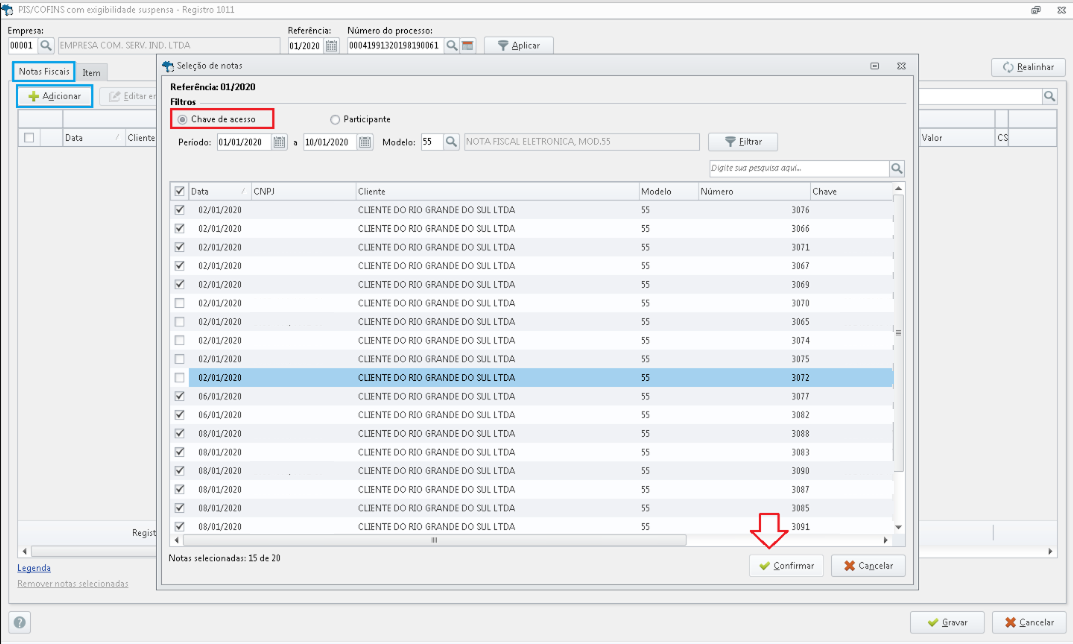 Chave de acesso: Através desta opção, será possível selecionar as notas pelos modelos de documentos eletrônicos, para isto, no módulo clique na guia Notas Fiscais > Adicionar > opção Chave de Acesso, informe o Período, selecione o Modelo eletrônico e clique em Filtrar, logo após selecione as notas desejadas e clique em Confirmar.