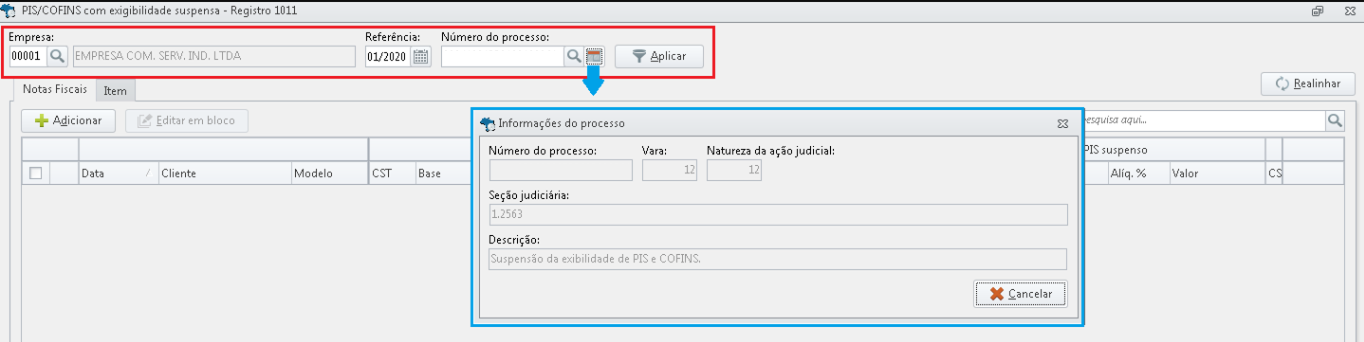 Ao acessar o módulo informe: Empresa, Referência e selecione Número do processo vinculado ao cadastro da empresa que receberá o detalhamento das contribuições com a exigibilidade suspensa, em seguida, clique em Aplicar. Será possível visualizar o detalhamento do processo neste módulo, inclusive realizar o movimento suspenso por processo cadastrado.