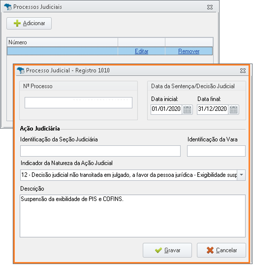 No cadastro da empresa deverá ser cadastrado o processo judicial com a exigibilidade suspensa de contribuição, para isto acesse: Cadastros > Empresas > Selecione a empresa > aba Federal > Sub-aba SPED Contribuições > Processos Judiciais, poderá adicionar, remover ou editar um processo judicial. Este cadastro alimenta o registro 1010 no SPED Contribuições.