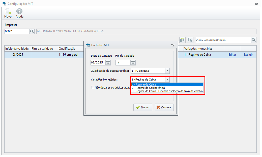 Como ajustar o erro no MIT: O contribuinte informou a opção "Regime de Competência" como critério de reconhecimento das variações monetárias na DCTFWeb de 01/2025 e ela é válida para todo o exercício fiscal. Retifique a Apuração do MIT para corrigir o campo CRVM e tente transmitir novamente.