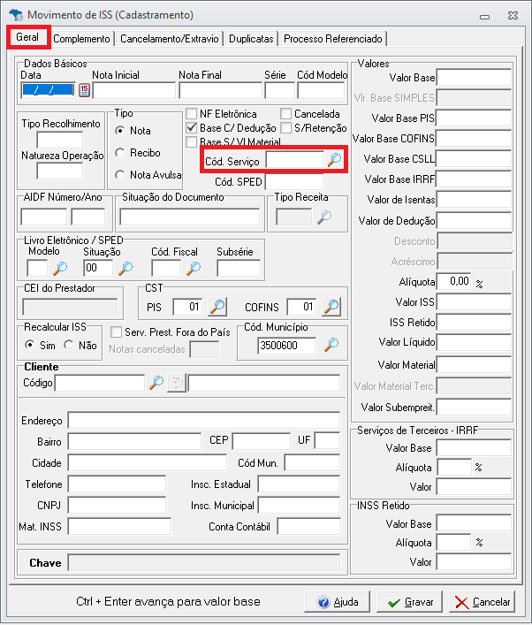 - Preencha o campo Cód. Serviço. Para empresas de Minas Gerais (MG), este campo fica como CNAE.