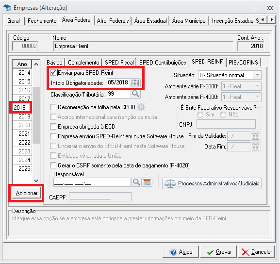 - Selecione a empresa desejada e clique na aba Área Federal → SPED REINF.