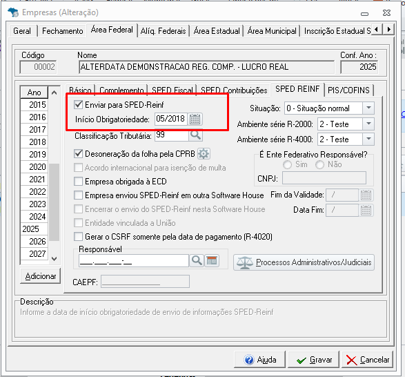 - Cadastro → Empresa →Área Federal→ SPED REINF