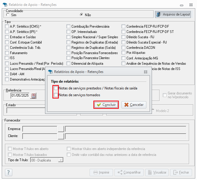 - Marque uma das opções: notas de serviços prestados/notas fiscais de saída ou notas de serviços tomados e clique em Concluir.