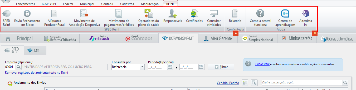 - Relatórios: Para geração de relatório de eventos enviados e de fechamentos do REINF. (Em caso de dúvidas clique aqui: https://ajuda.alterdata.com.br/pages/viewpage.action?pageId=60458961)