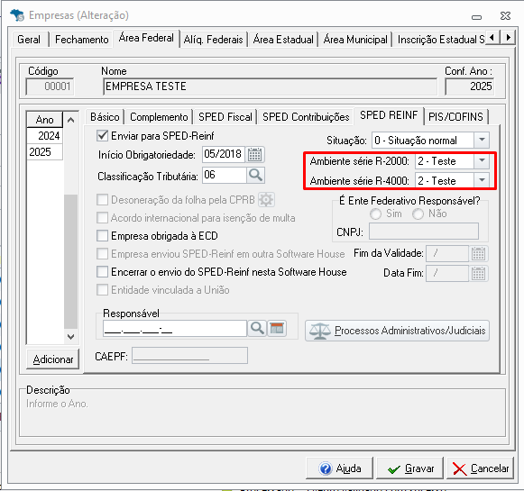 No campo Ambiente série R-xxxx, será necessário informar o tipo 2 - Teste.