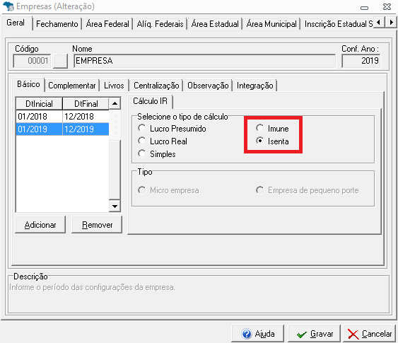 Selecione o Tipo de Calculo da empresa, se é Imune ou Isenta, conforme figura ao lado.