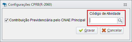 - Clique no ícone da lupa do campo Código de atividade e selecione o código de Atividade da Contribuição Previdenciária da empresa e grave.