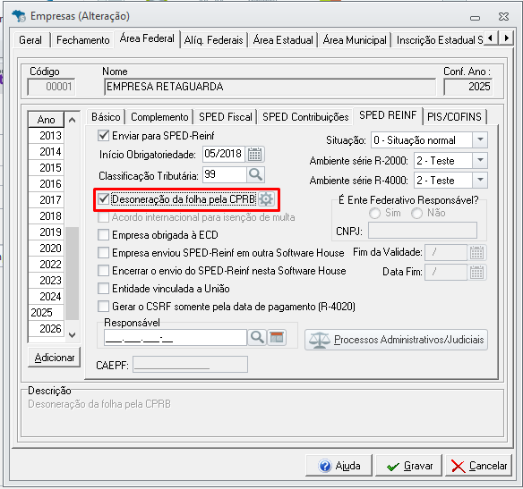REINF - Erro ao gerar o R-2060: Para geração da Contribuição Previdenciária sobre a Receita Bruta a empresa deve estar configurada com Desoneração da folha pela CPRB