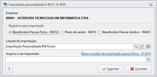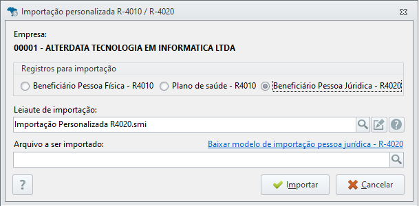 - Para baixar o modelo de planilha padrão para importação do R-4020, clique aqui.