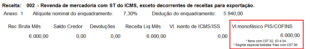 Para empresas varejistas de bebidas frias, a legislação estabelece alíquota zero de PIS e COFINS para itens escriturados com o CST 06. Visto que no PGDAS atualmente não dispõe um campo específico para receitas com alíquota zero na apuração das notas fiscais de saída de venda ou cupom fiscal de bebidas frias com CST 06, a receita referente a esse lançamento deve ser considerada no total monofásico.