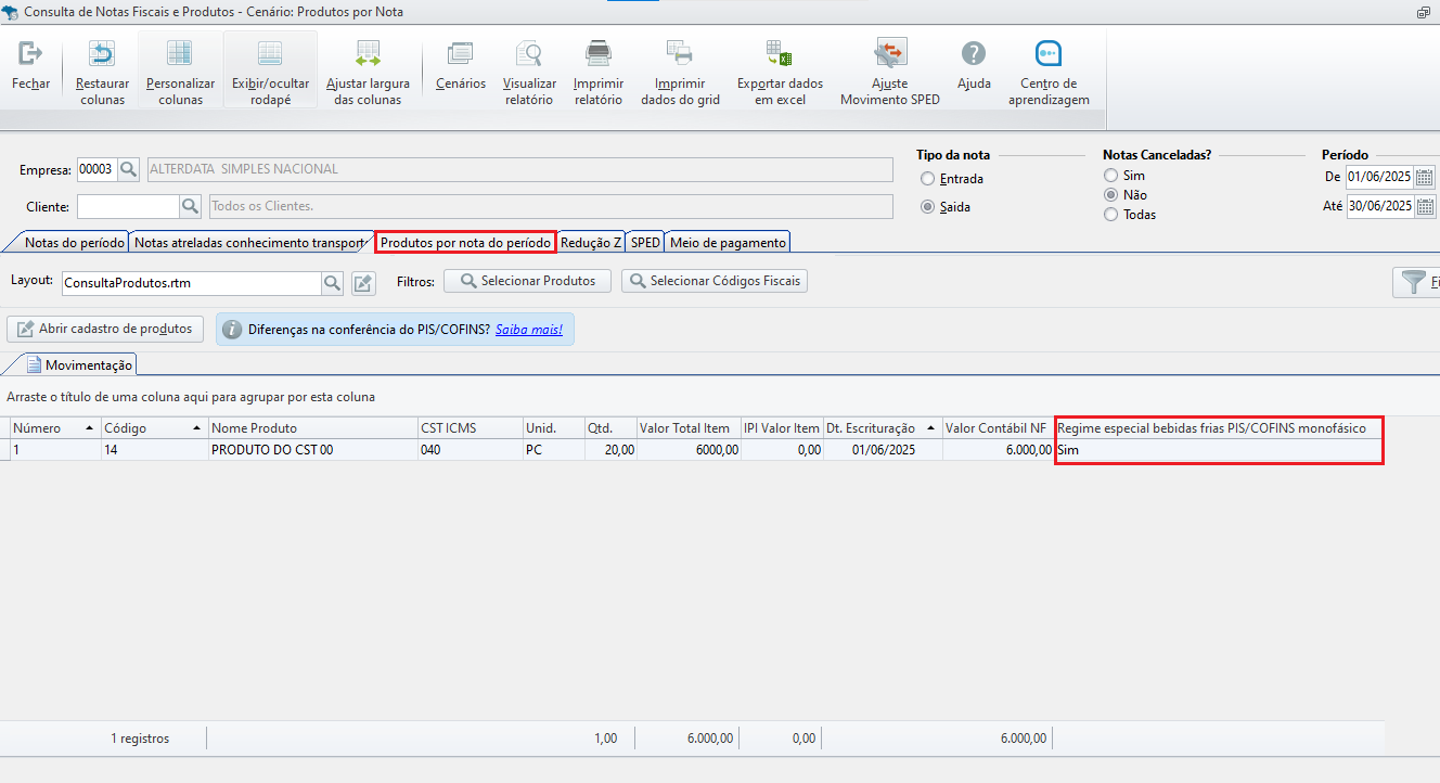 3. Vá na sub aba Produtos por nota do período  e informe a coluna Regime especial bebidas frias PIS/COFINS monofásico;