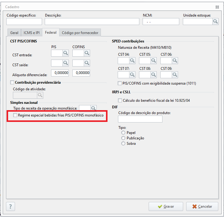 4. Marque a opção Regime especial bebidas frias PIS/COFINS monofásico;