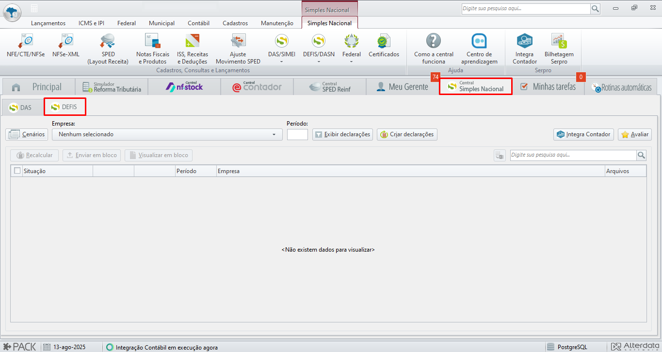 Esta solução torna o processo do usuário mais rápido e prático. O envio pode ser realizado diretamente na Central do Simples Nacional. - Adicionamos a sub-aba DEFIS na Central do Simples Nacional. Por meio dessa funcionalidade, o usuário pode verificar as declarações de várias empresas simultaneamente, realizar o envio das declarações e acessar os recibos e relatórios armazenados após a transmissão da declaração.