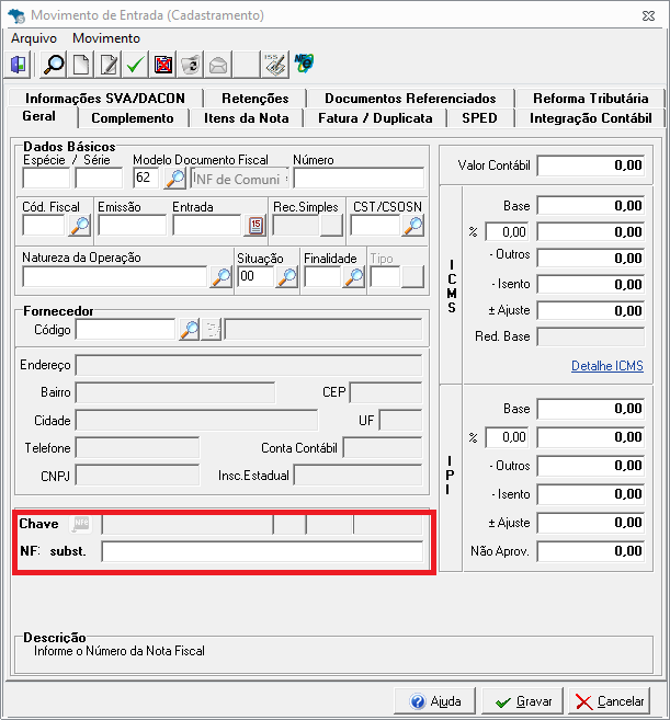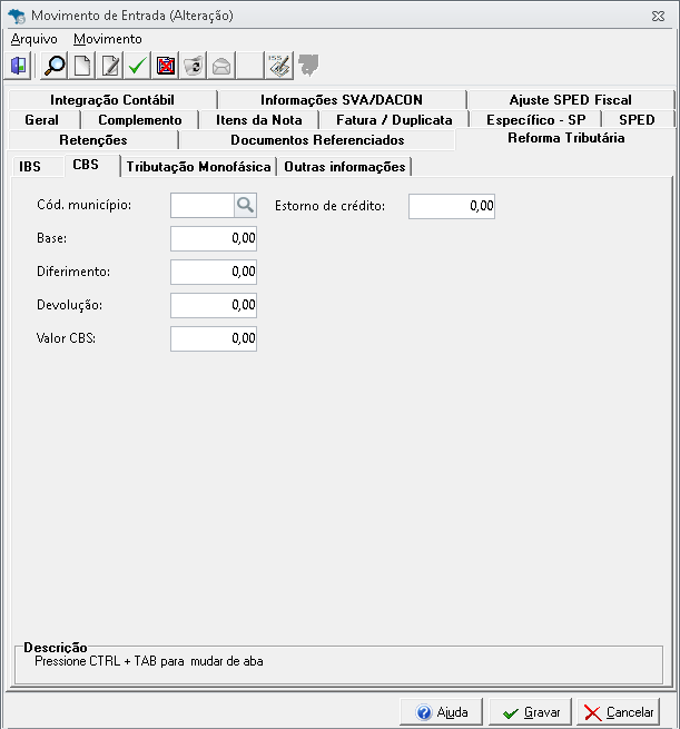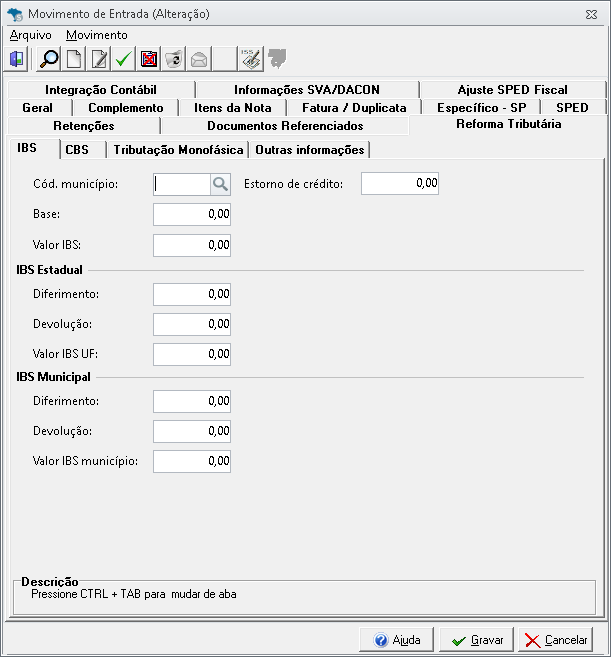 Controle de Créditos: Novos campos de Estorno de Crédito de IBS e CBS (na capa e nos itens), garantindo o controle fiscal detalhado.