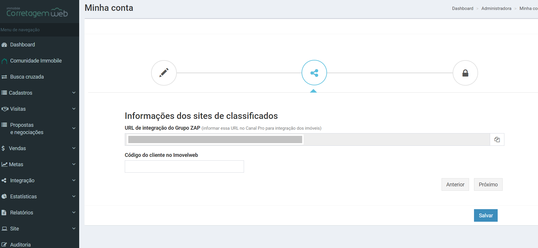Copie a URL de integração e informe no Canal Pro para integração dos imóveis.