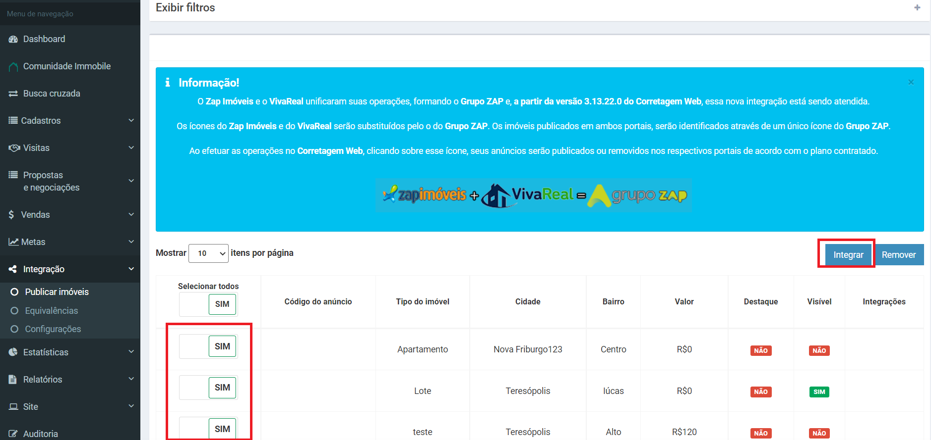 - No menu do Corretagem Web, clique sobre 'Integração' e, em seguida, em 'Publicar Imóveis'.