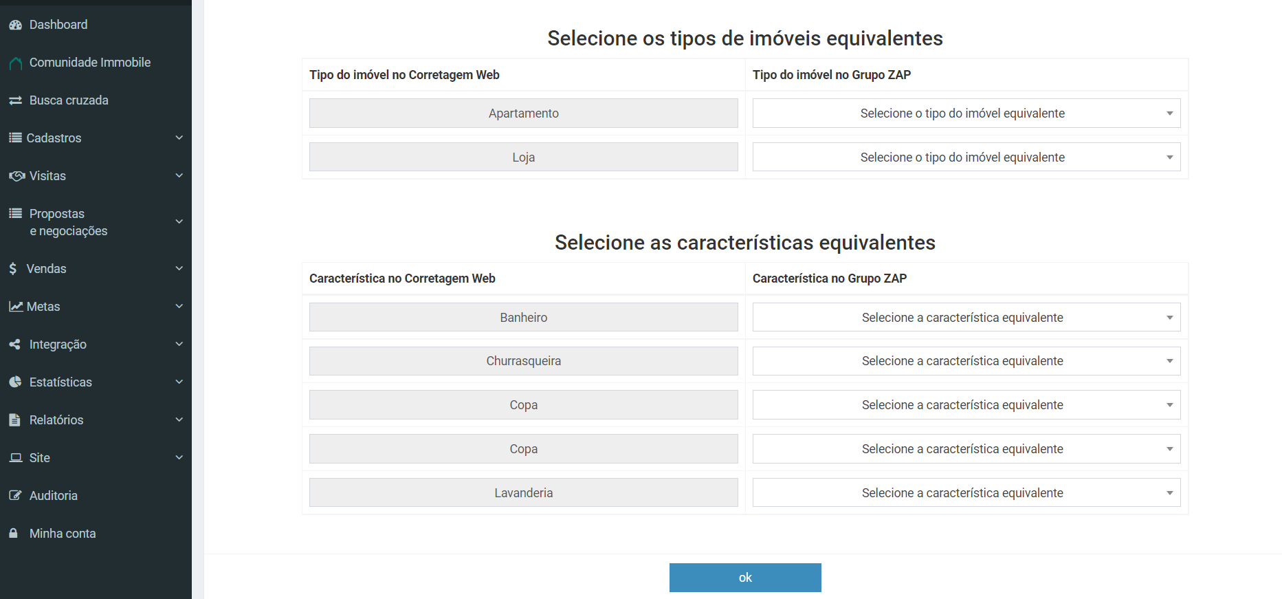 - Em seguida, selecione a opção 'Grupo ZAP', será apresentada a tela de Equivalências Grupo ZAP, após selecionar todas clique em OK.