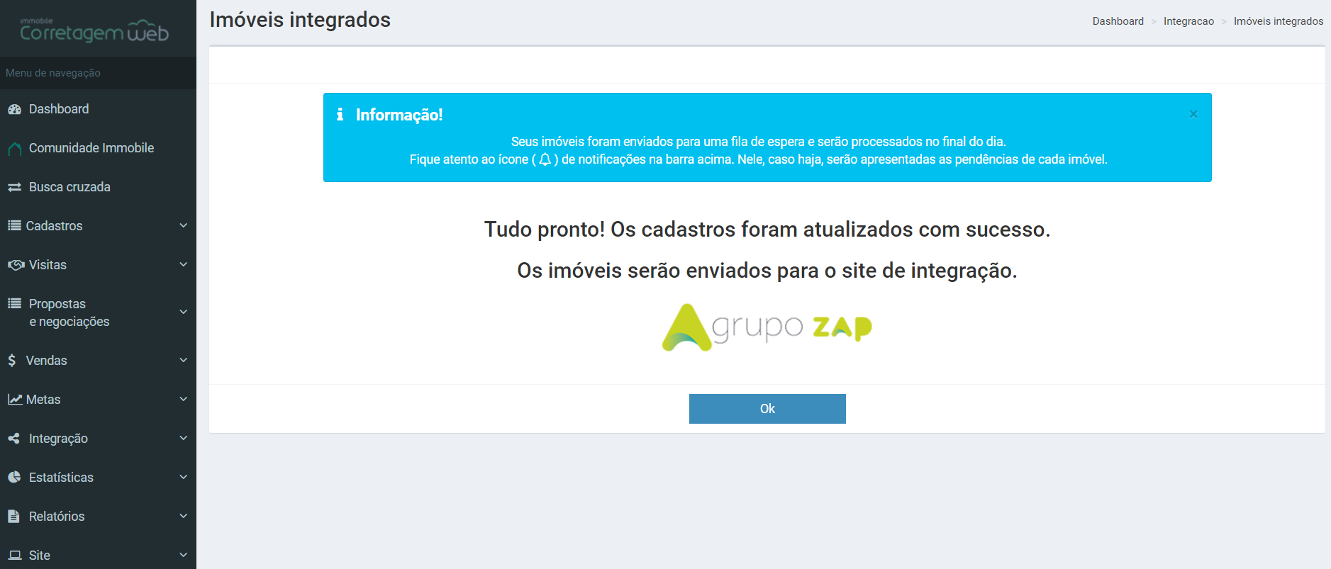 - Será apresentada uma mensagem, ao clicar em 'OK', os imóveis serão enviados para uma lista de espera, aguardando aprovação do site.