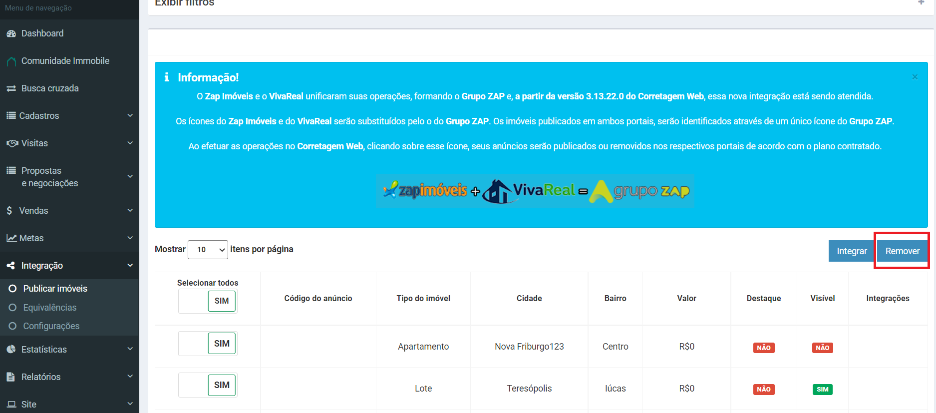- Neste momento, ao lado do imóvel selecionado, aparecerá um ícone do Grupo ZAP desabilitado, caracterizando que este imóvel foi integrado e ainda não está aprovado.